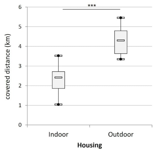 Mean daily distance (km) covered by the cats according to their housing condition (indoors (n = 15) versus outdoors (n = 8)). (***) indicates p < 0.001.