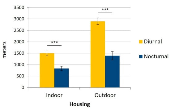 Mean daily nocturnal and diurnal distance (m) covered by the cats according to their housing conditions (indoors (n = 15) versus outdoors (n = 8)). Error bars represent standard errors, (***) indicates p < 0.001.