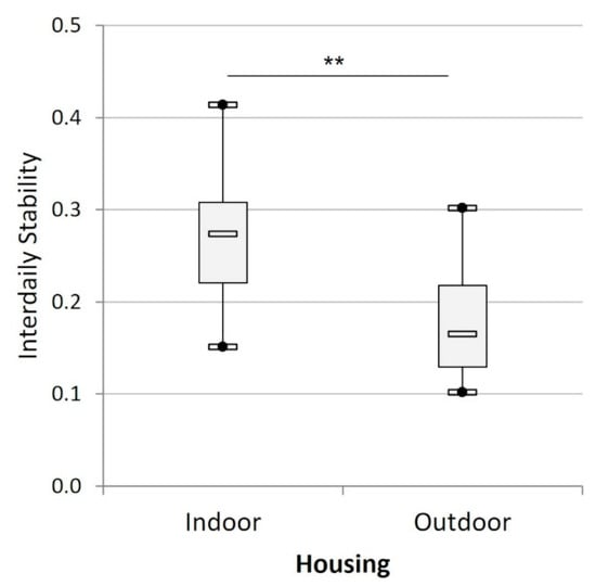 Mean interdaily stability of the feeding rhythm of the cats according to their housing condition (indoors (n = 15) versus outdoors (n = 8)). (**) indicates p < 0.01.