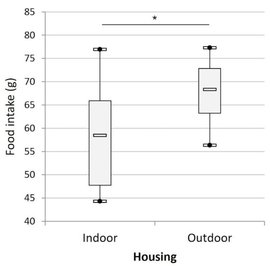 Mean daily food consumption (g) of the cats according to their housing condition (indoors (n = 15) versus outdoors (n = 8)). (*) indicates p < 0.05.