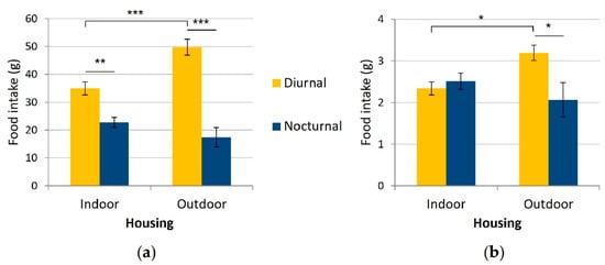 Mean daily (a) and hourly (b) nocturnal and diurnal food intake (g) of the cats according to their housing condition (indoors (n = 15) versus outdoors (n = 8)). Error bars represent standard errors, (*) indicates p < 0.05, (**) indicates p < 0.01, (***) indicates p < 0.001.