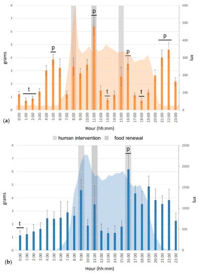 Mean food consumption (g, bars) and luminosity (lux, area) during a day cycle of the cats, indoors (a, n = 15) and outdoors (b, n = 8). Error bars represent standard errors, (p) indicates a significant peak, (t) indicates a significant trough (for more details, see [29]).