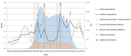 Mean food consumption (g, every hour) of the cats throughout the day according to their housing condition (indoors (n = 15) versus outdoors (n = 8)). Error bars represent standard errors, (*) indicates p < 0.05, (***) indicates p < 0.001.