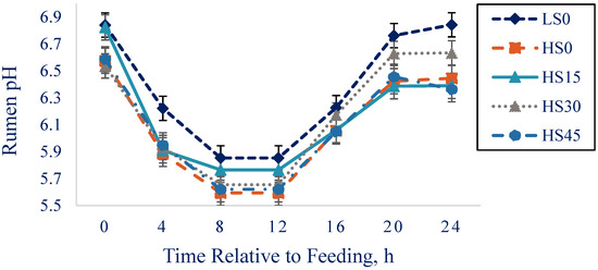 Least squares means (± SE) for rumen pH response to feeding (0 h) for cows in LS0, HS0, HS15, HS30, and HS45 treatments from 0 to 24 h relative to feeding (at 1400 h). Treatment: p < 0.0001; time: p < 0.0001; and no time × treatment interaction: p = 0.44.
