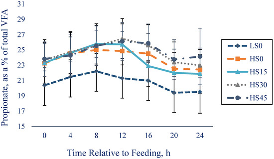 Least squares means (± SE) for propionate, as a percentage of total VFA response for cows in LS0, HS0, HS15, HS30, and HS45 treatments from 0 to 24 h relative to feeding (at 1400 h). Treatment: p < 0.0001; time: p < 0.0001; and treatment × time interaction: p < 0.0001.
