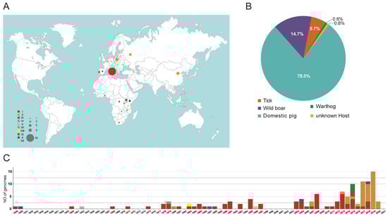 Distribution of African swine fever virus genome sequences included in the curated dataset. (A) Map indicates the collection locations of the ASFV genome sequences. (B) Distribution of the host of the ASFV genome sequences. (C) Distribution of the collection date of the ASFV genome sequences.