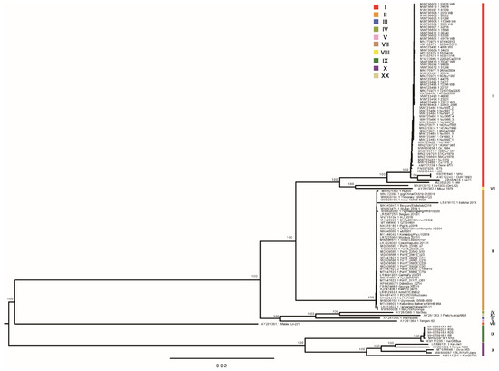 A total of 147 published ASFV complete genomes were retrieved from the NCBI Nucleotide database on 10 November 2021. Source information including genotype, host, sampling location, and collection date was obtained either by GenBank records or a search of the literature. The genomes in the dataset belonged to 11 genotypes including genotype I (73 genomes), genotype II (52), genotype III (2), genotype IV (2), genotype V (1), genotype VII (1), genotype VIII (1), genotype IX (6), genotype X (5), genotype XX (3), and genotype XXII (1).