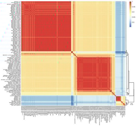 Sequence similarity matrix plot of ASFV genome sequences in the curated dataset. The level of identity of pairwise genome sequences is indicated by different colors. Dark red represents 100% identity, and blue represents lower identity. The maximum likelihood phylogenetic tree of ASFV genome sequences is shown on the right.