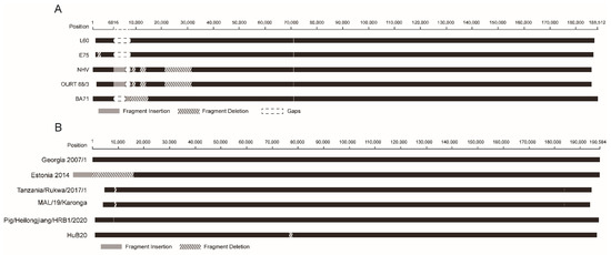 Structural variations in ASFV genotype I (A) and genotype II (B) genomes. Fragment insertion is shown in dark grey blocks. Fragment deletion is shown in dashed blank blocks. Blank blocks indicate gaps introduced for alignment purposes. Nucleotide position in the reference genome L60 (A) and genome Georgia 2007/1 (B) is shown.