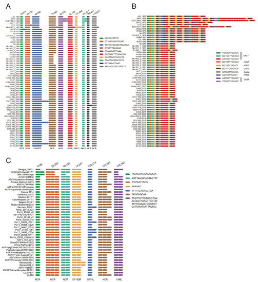 Sequence variation of the tandem repeat sequences (TRS) in ASFV genomes. (A) Variation of TRS in other regions in ASFV genotype I genomes. (B) Variation of TRS in the coding region of B602L gene in ASFV genotype I genomes. (C) Variation of TRS in ASFV genotype II genomes. The arrangement of the TRS in each genome was listed according to the nucleotide sequence. Each arrow of a different color represents a type of repeat unit with a specific nucleotide sequence. The nucleotide sequence of each type of repeat unit was also shown. The amino acid sequence of each type of repeat unit in the TRS in the coding region of B602L gene was also shown.