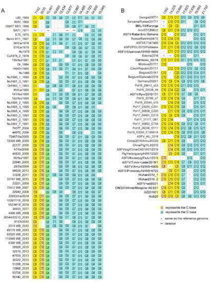 The ASFV genome sequences were aligned using MAFFT software (version 7.475) [27]. Genome sequences containing artificial modification, annexation bases, unknown bases, and unconfirmed large-fragment deletion were identified.