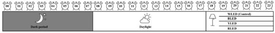 The daily photoperiod and additional LED light program. WLED (control): the group was exposed to white LED light (400–740 nm), representing today’s human home environment. BLED: the group was exposed to blue LED light (450–490 nm). YLED: the group was exposed to yellow LED light (560–590 nm). RLED: the group was exposed to red LED light (635–700 nm).