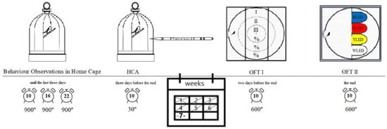 OFT I and II were performed in different controlled research rooms with the same breeding conditions (25 ± 2 °C temperature, 55 ± 5% relative humidity, and 35–40 dB noise level) where the birds were raised throughout the experiment. The behavioural analysis platform 1 (BAP-I) designed for this work was used for OFT I (Figure 3). The analysis platform was built by modifying a platform used in previous experiments [53]. The birds’ interest in an unfamiliar object they were thought to have never seen before was assessed throughout the test. Only one bird was transported in the same transport cage from the breeding habitat to the testing room for each test run. The bird was left inside the platform where the observation would take place after the 5 min adaptation period (Figure 3). The time spent by the birds in three equal parts of the platform for 10 min from the top of the platform was calculated, and their interest in the unfamiliar object hanging in the centre was assessed.