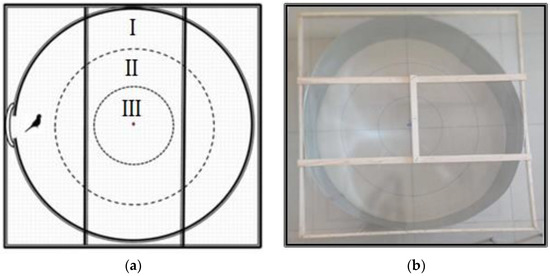 Behavioural analysis platform 1 (BAP I) for OFT I ((a) diagram, (b) photo). I, edge of the platform; II, middle of the platform; III, centre of the platform.