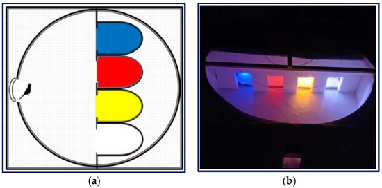 The cages were placed in four compartments (for blue, white, yellow, and red lights) made of expanded polystyrene (TS7316- EN13163), the front parts of which were open and opaque, specially designed for the study with dimensions of 120 × 60 × 60 cm (Figure 1). Each group was exposed to 10 h of natural light (between 08:00–17:59 h) and 6 h of LED light (between 18:00–23:59 h) in the compartments. For 7 weeks, the first week of which was planned as an adaptation, the birds were exposed to coloured LED lights (white 400–740 nm, blue 450–490 nm, yellow 560–590 nm, and red 635–700 nm for 6 h/day) in such a way as to have 10 lux of light intensity at the base of the cage (Figure 1) [49].