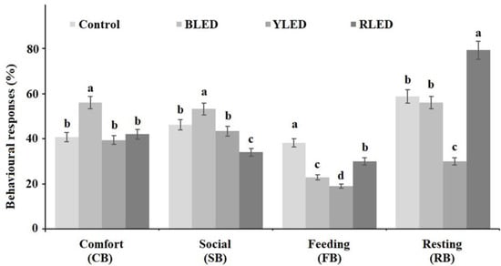 The differences in observations were found to be statistically significant at the level of p < 0.05. Figure 5 shows the results. In the study, the control group of birds displayed mostly feeding behaviours in their cages. The BLED group of birds showed more comfort and social behaviours. The RLED group of birds spent most of their time resting.