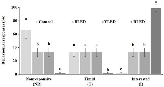 If careful observation is not undertaken during an HCA test, then interested behaviours may be confused with aggressive responses to the stimuli. Moreover, similar behaviours in animals may appear as a part of the fight-or-flight response. In addition to the animal’s response to a threat, recession and fear behaviour may be an indication of a stress response, and stress adversely affects the health and productivity of birds at varying levels [72]. Although the responses of the birds in the RLED group were considered interested behaviour, the behaviour of the birds in this group can also be considered as an aggressive response to a sudden stimulus.