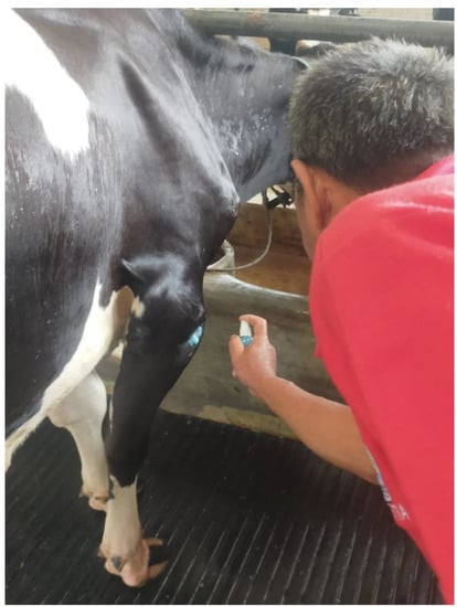 An FMD-afflicted dairy cow in Indonesia in recovery, with a chronic decubitus ulcer receiving topical spray treatment of lesions with the topical anaesthetic wound formulation (TAF) resulting in improved wound healing.