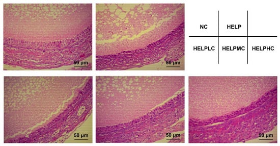 The effects of COS supplementation on ovarian morphology in the laying hens are presented in Figure 1. The morphological structures of the ovaries in the hens in the NC group were normal, with orderly arrangements of granulosa cells. The ovaries in the hens in the HELP group showed decreased numbers of granulosa cells and loose and irregular arrangements of granulosa cells, whereas dietary COS supplementation, especially at the dosages of 400 or 800 mg/kg, inhibited ovary damage by alleviating these histological alterations.