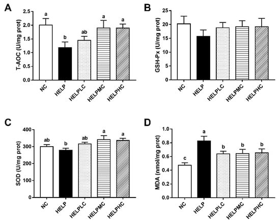 As shown in Figure 2, there were no significant differences in ovarian GSH-Px activity among all the groups (p > 0.05). The hens in the HELP group showed significantly lower activities of ovarian T-AOC and higher levels of MDA compared with those in the NC group (p < 0.05), and there were no significant differences in ovarian SOD activities between the HELP group and the NC group (p > 0.05). When compared with hens in the HELP group, ovarian T-AOC and SOD activities were significantly increased in the hens in the HELPMC and HELPHC groups (p < 0.05), and MDA levels were significantly decreased in the hens in the HELPLC, HELPMC and HELPHC groups (p < 0.05).