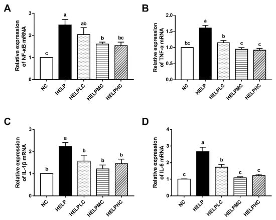 Effects of chitosan oligosaccharide on ovarian inflammation in the laying hens. Relative mRNA expression of (A) NF-κB, (B) TNF-α, (C) IL-1β and (D) IL-6 in the ovaries. Each mean represents one layer/replicate, six replicates/treatment. Means lacking a common superscript are significantly different (p < 0.05). Abbreviations: HELP, high-energy low-protein; HELPLC, HELPMC and HELPHC, high-energy low-protein diet supplemented with 200, 400 and 800 mg/kg chitosan oligosaccharide, respectively; IL-1β, interleukin-1β; IL-6, interleukin-6; NC, normal control; NF-κB, nuclear factor kappa B; TNF-α, tumor necrosis factor-α.