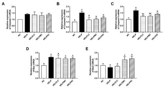 Effects of chitosan oligosaccharide on ovarian apoptosis-related gene expression in the laying hens. Relative mRNA expression of (A) caspase 3, (B) caspase 8, (C) caspase 9, (D) Bax and (E) Bcl-2 in the ovaries. Each mean represents one layer/replicate, six replicates/treatment. Means lacking a common superscript are significantly different (p < 0.05). Abbreviations: Bax, B cell lymphoma-2 associated X protein; Bcl-2, B cell lymphoma-2; HELP, high-energy low-protein; HELPLC, HELPMC and HELPHC, high-energy low-protein diet supplemented with 200, 400 and 800 mg/kg chitosan oligosaccharide, respectively; NC, normal control.