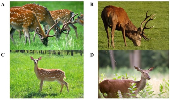 Although the earliest appearance of the Cervidae family can be traced back to the late Oligocene period [1], the cold-resistant Cervidae appeared during the late Pliocene period owing to a climate-cooling event. The fossils of ancient Cervus from the late Pliocene and Pleistocene periods portray very similar characteristics to those of modern-day sika deer. The modern-day wapiti, however, are believed to have originated from the ancient wapiti during the early Pleistocene period [2]. The sika deer (Cervus nippon) have spread across East Asia, from central China in the west to Japan and Korea in the east, and from the extreme Eastern tip of Russia in the north to China and Vietnam in the south [3]. The female and male Sika deer and wapiti demonstrate numerous differences in terms of morphology and physiology; for example, the male deer have antlers, the bony appendages shown in Figure 1.