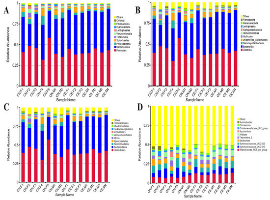 Bar plot of relative abundance. (A) Taxonomic level of phylum. (B) Taxonomic level of class. (C) Taxonomic level of order. (D) Taxonomic level of genus. Each bar represents the top ten bacterial species ranked by the relative abundance in each individual sample.