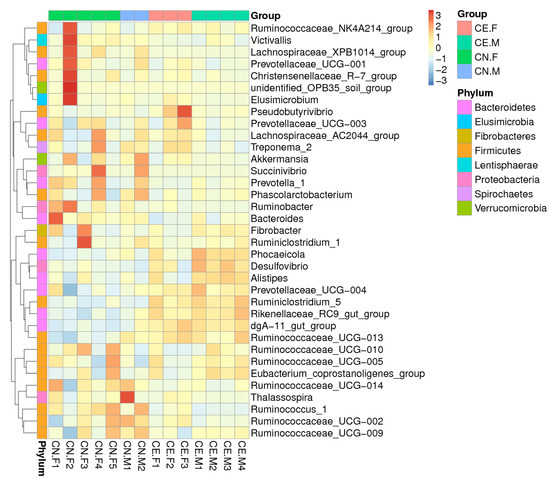 The following supporting information can be downloaded at: https://www.mdpi.com/article/10.3390/ani12182468/s1, Figure S1: Statistical analysis of OTUs clustering and annotation for each sample; Figure S2: Hierarchical tree of the taxa composition at each taxonomic level was constructed by GraPhlAn; Figure S3: The species classification tree statistics; Figure S4: Principal component analysis (PCA) plot; Figure S5: Unweighted UniFrac-Principal coordinate analysis (PCoA); Figure S6: Dendrograms were constructed using unweighted pair-group method using arithmetic mean (UPGMA); Figure S7: Cladograms indicating the polygenetic distribution of bacterial lineages between CE.F and CN.F by linear discriminant analysis (LDA) effect size (LEfSe). Coloring principles: Species with no significant difference were uniformly colored yellow, the species of Biomarker were colored following the different group, the red node was the bacteria group that played an important role in the red group, and the green node was indicated to play an important role in the green group bacterial taxa.