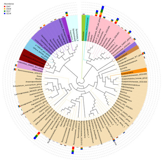 To explore the diversity of the species composition of the samples, the OTUs obtained by clustering the effective tags were subjected to species annotation. First, the OTU clustering and annotation results of each sample were statistically analyzed (Figure S1). Subsequently, a phylogenetic tree was generated. The taxonomic tree generated using GraPhlAn showed the kingdom at the center, with the phylum, class, order, family, and genus branching outwards [27]. The phylogenetic analysis showed that Firmicutes, Bacteroidetes, and Proteobacteria were the most abundant phyla (Figure S2). To analyze the species classification tree, the top 10 genera with the highest relative abundance were chosen and the results were displayed using self-developed drawing tools (Figure S3) [28].