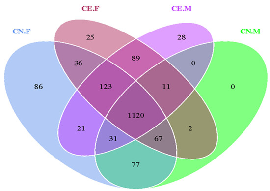 Raw paired-end (PE) reads were obtained using the Illumina HiSeq sequencing platform. The lean tags obtained by filtering for quality were subjected to subsequent analysis after the removal of chimeric sequences. Statistical analyses were carried out at each step of the data processing, and the results are shown in Table 1. Abbreviations: CE.F stands for female wapiti, CE.M stands for male wapiti, CN.F stands for female sika deer, CN.M stands for male sika deer.