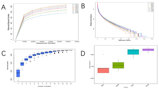 (A) The rarefaction curves for the species abundance of the samples. The horizontal axis represents the sequence number, and the vertical axis represents the observed species number. Each curve in the figure represents a sample, presented in a different color. (B) Rank abundance curves of the bacterial OTUs derived from each sample. Different samples are represented by curves of different colors. The abscissa is the species rank, and the ordinate is the corresponding relative abundance. (C) Species accumulation boxplot. The abscissa represents the sample size and the ordinate represents the number of OTUs after sampling. The results reflect the rate of new OTUs under continuous sampling. (D) Box plots of observed species.