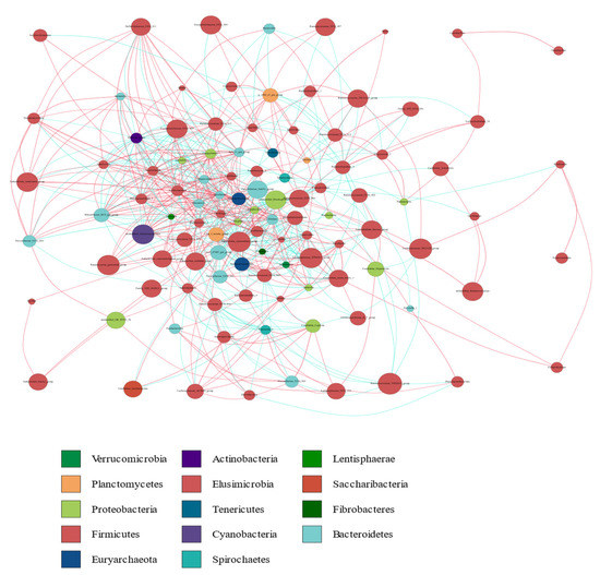The co-occurrence network diagram provided a new perspective for the study of the community structure and functions of the complex microbial environments. Since the co-occurrence relationships between microorganisms in different environments are different, we can study the impact of different environmental factors on microbial adaptability and identify the dominant species and closely interacting groups in an environment using the species co-occurrence network diagram. These dominant species and groups often play unique and important roles in maintaining the stability of the microbial community structure and its function in the environment. Therefore, we calculated the correlation index (Spearman correlation coefficient (SCC) or Pearson correlation coefficient (PCC)) of all the samples and presented the obtained correlation coefficients in a table. The correlation coefficients obtained were sorted using a cutoff value of 0.6, and a map was generated by combining these data with the species abundance data. Furthermore, a network analysis revealed the co-occurrence and co-exclusion relationships between the dominant bacterial genera belonging to 14 dominant bacterial phyla. The most common phyla found on the nodes were Firmicutes, Bacteroidetes, and Proteobacteria (Figure 8). This result was consistent with our aforementioned findings.