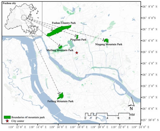 The location map of five urban mountain parks in the subtropical coastal areas of China was selected in this study.