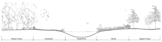 Schematic diagram of five typical vegetation habitats in urban mountain parks. From left to right are dense forest habitat, grassland habitat, waterfront habitat, shrub habitat, and sparse forest habitat.