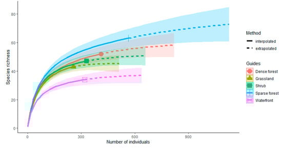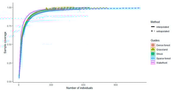 Sample completeness curves of bird communities in different vegetation habitats in urban mountain parks. The filled graphs (triangles, circles, etc.) represent the sample coverage.