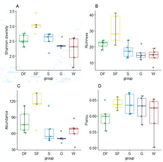 Comparison of bird diversity (A), richness (B), abundance (C), and Pielou index (D) in five vegetation habitats in urban mountain parks in Fuzhou, China. DF, dense forest; SF, sparse forest; S, shrub; G, grassland; W, Waterfront.