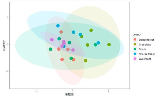 To investigate species variability among different vegetation habitats, nonmetric multidimensional scaling (NMDS) [] was used to analyze the composition of bird communities in different vegetation habitats. Then, we derived the species composition of bird communities between habitats and we compared them using analysis of similarity (ANOSIM), a nonparametric multidimensional ranking method for detecting differences between sample groups of communities, using the function “anosim” from the vegan package of R 4.0.2. ANOSIM generates R statistics [] that range from 0 to 1 and give an absolute measure of the degree of separation of the groups (R > 0.75, well separated; 0.25 < R < 0.75, overlapping to some extent but different; R < 0.25, almost impossible to separate).