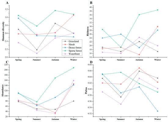 Comparison of bird diversity (A), richness (B), abundance (C), and Pielou index (D) with seasonal variation in five habitats in urban mountain parks in Fuzhou, China.
