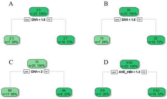 Relationships between bird diversity (A), richness (B), abundance (C), and Pielou index (D) of urban mountain parks based on regression tree and vegetation variables from the results of principal component analysis (PC1 to PC4). DIVt, diversity of trees; AVE_HBt, average branch height under trees.
