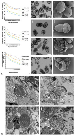 - Mousavi, S.M.; Afgar, A.; Mohammadi, M.A.; Mortezaei, S.; Faridi, A.; Sadeghi, B.; Fasihi Harandi, M. Biological and morphological consequences of dsRNA-induced suppression of tetraspanin mRNA in developmental stages of Echinococcus granulosus. Parasit. Vectors 2020, 13, 190. [Google Scholar] [CrossRef] [PubMed]