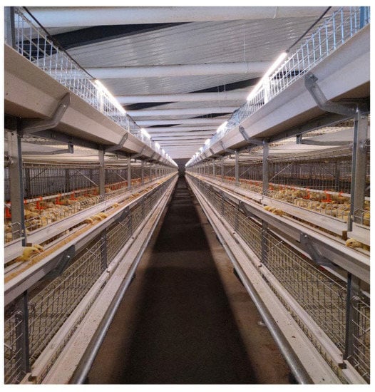 A total of 960 one-day-old, white-feathered broilers (Hubbard broiler) were purchased from Enkang Animal Husbandry Co., Ltd. (Hebei, China) and randomly divided into 4 treatment groups (n = 240/treatment). Each treatment group had 6 replicates consisting of 40 broilers in each replicate. Three cages were used in the chicken houses of white-feathered broilers (Figure 1), with good ventilation and lighting. The indoor temperature was maintained at 22–25 °C, and the humidity was maintained at 50–60%. The ration was fed automatically and regularly (6:00 in the morning and 3:00 in the afternoon). The diet formula is shown in Table 1. Diets were formulated following the nutrient requirement recommendations of the National Research Council (NRC, 1994) []. An automated waterline system was used in the broiler house (Figure 1). All chickens received feed and water ad libitum. The four treatment groups were the solvent control group (control group), oregano oil and macleaya cordata mixed oral solution group (OS group), oregano oil oral solution group (OEO group), and macleaya cordata oral solution group (MCE group). The four oral solutions were added to the waterline system of the corresponding four treatment groups (control group, OS group, OEO group, and MCE group) every day. The dosage of oral liquid was 125 mL in 1000 L water.