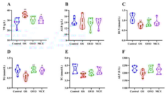 Serum biochemical parameters of broilers. (A) Total protein (TP). (B) Albumin (ALB). (C) Urea nitrogen (BUN). (D) Triglycerides (TG). (E) Total cholesterol (TC). (F) Alkaline phosphatase (ALP). * p < 0.05, ** p < 0.01, vs. control group; # p < 0.05, ## p < 0.01, vs. OS group (n = 6).