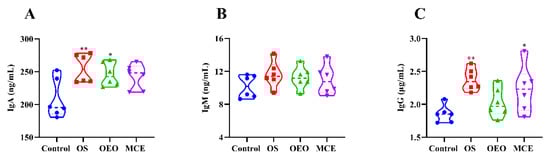 Figure 5 and Table S1 show the changes in serum immunological indexes of broiler chickens in different treatment groups. Serum immunoglobulin A (IgA) levels were significantly increased in the OS (255.13 ± 21.87 U/mL) and OEO groups (245.87 ± 17.89 U/mL) compared to the control group (208.33 ± 29.87 U/mL) (p < 0.05). Serum immunoglobulin G (IgG) levels were significantly higher in the OS (2.38 ± 0.17 ng/mL) and MCE groups (2.23 ± 0.35 ng/mL) than that in the control group (1.85 ± 0.13 ng/mL) (p < 0.05).