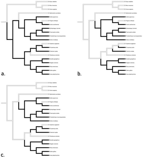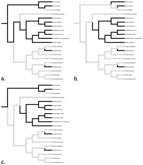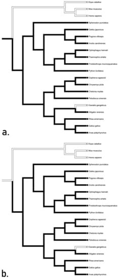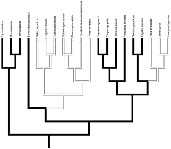 Using available literature, the presence and/or absence of TLR genes were collected for all TLR genes currently recognized in non-avian members of Reptilia from supplementary data in []. Using character optimization techniques, the presence of TLR genes was optimized onto a phylogeny including members of Mammalia as the outgroup clade and both avian and non-avian reptiles (Equus caballus, Mus musculus, Homo sapiens, Sphenodon punctatus, Gekko japonicus, Pogona vitticeps, Anolis carolinensis, Ophiophagus hannah, Thamnophis sirtalis, Protobothrops mucrosquamatus, Python bivittatus, Gopherus agassizii, Chrysemys picta, Chelonia mydas, Pelodiscus sinensis, Gavialis gangeticus, Alligator sinensis, Rhea americana, Gallus gallus, Anas platyrhynchos). Our phylogeny was created using various hypotheses on vertebrate evolution [,,,]. All analyses, including the creation of a matrix, were performed in Mesquite (v. 3.61) [] using a most parsimonious reconstruction framework. The traits were optimized using accelerated (ACCTRAN), delayed (DELTRAN), and Mixed optimization procedures for each trait, which may generate different outcomes depending on the algorithm [,].