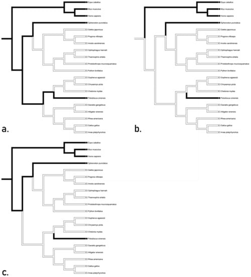 Character optimization of TLR 9 using accelerated delayed, and mixed transformations unequivocally suggesting a loss in squamates, testudines, and crocodilians. The accelerated (a) transformation suggests conservation in Sphenodon and Pelodiscus, while the delayed (b) transformation suggests convergence between Mammalia and the aforementioned taxa. The mixed transformation (c) suggests conservation in Sphenodon and convergence in Pelodiscus.