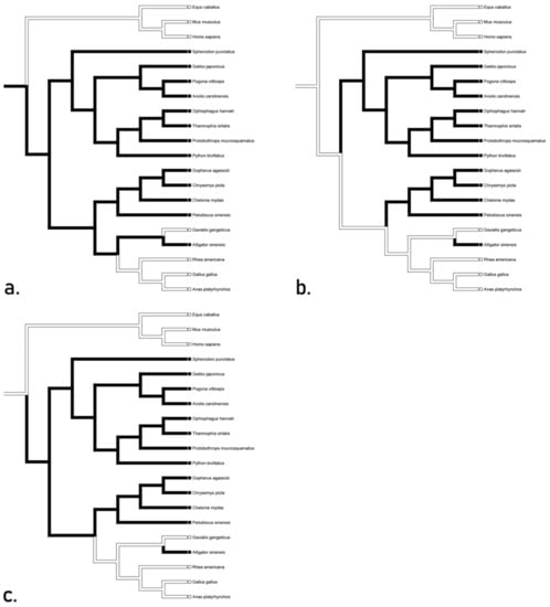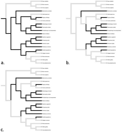Character optimization of TLR 22 using accelerated (a) delayed (b), and mixed (c) transformations. The accelerated transformation proposed conservation throughout Reptilia with a loss in Gekko, Anolis, and Alligator while delayed transformation also suggests convergence between Sphenodon, Pogona, Serpentes, Testudines, and Gavialis. Mixed transformation suggests conservation in all Lepidosauria except for losses in Gekko and Pogona, as well as convergence with and within Archosauria.