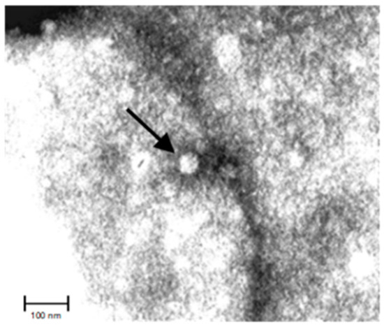 EqHV is a virus with spherical virions measuring 40–60 nm (Figure 1) and a lipid envelope characterized by a single, small capsid protein and two different envelope glycoproteins (E1, E2), organized in icosahedral units [6,7,8,9]. Whether the viral protein composition of the virions of most Flavivirus is known (the general structure is an icosahedral array of 90 envelope glycoprotein heterodimers forming a smooth surface), the same knowledge is not available for other members of the Flaviviridae family, which shows a lack of proteomic analysis data. However, recent studies reported that host and tissue cells influence the final composition of the virion envelope: the actual functions of these accessory proteins included during the budding and released from the host cell, if present, needs further study [10].