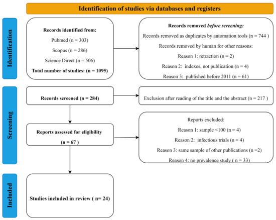 In detail, [19,22,53,58] were excluded for the number of samples <100; refs. [33,48] were excluded because the sample employed seemed to be the same as [38,42], respectively. Because the studies present data on infection trials and not seroprevalence studies, refs. [11,17,21,24] were excluded. In Figure 3, the PRISMA flowchart is presented.