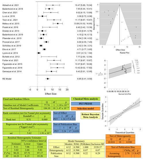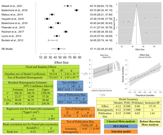 Then, meta-analysis on both prevalence and seroprevalence in equids was performed using a random model effect (REML method), using the DerSimonian–Laird method. The publication bias was verified by the funnel plot, which is a scatter plot of the effect (prevalence) on the x-axis and a measure of the study’s precision (inverse of standard error) on the y-axis, and the asymmetry of this graph may suggest publication bias. The Rank correlation test and the Egger statistical test were used to confirm or not the asymmetry of the funnel plot. Moreover, according to [63] selection model, PET PEESE analysis, and Robust Bayesian Meta-Analysis (RoBMA) were performed to further confirm publication bias. All statistical analyses were performed using JASP software version JASP (version 0.16.3, University of Amsterdam, Amsterdam, The Netherlands).